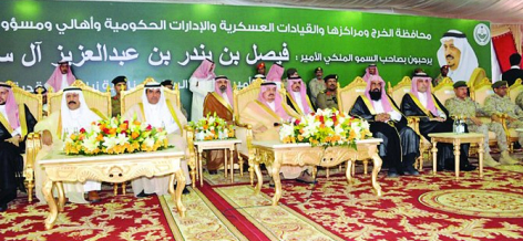 عقب ذلك ألقى سمو الأمير فيصل بن بندر بن عبدالعزيز كلمة خلال الحفل قال فيها: أشعر اليوم بسعادة غامرة وأنا بينكم حاملاً لكم تحيات وشكر خادم الحرمين الشريفين الملك سلمان بن عبدالعزيز – حفظه الله – وتقديره لكم جميعاً في أرجاء هذه المحافظة الغالية، ان الخرج هي التاريخ هي الموقع الاستراتيجي الهام وهي مقدرة دائما بمواقفها ومواقف رجالاتها الأوفياء.