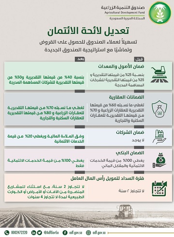 صدرت موافقة مجلس إدارة صندوق التنمية الزراعية على تعديلات لائحة الائتمان والتي تمت بناء على مراجعات دورية لهذه اللائحة، تماشياً مع استراتيجية الصندوق الجديدة، وتسهيلًا لعملاء الصندوق للحصول على القروض، وتهدف اللائحة الجديدة إلى تسهيل إجراءات العمل في دراسة طلبات الإقراض في مجالات القروض العادية وقروض المنشآت الصغيرة والمتوسطة والقروض الاستثمارية.