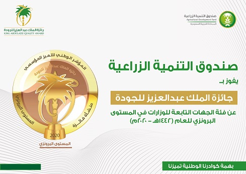 فاز صندوق التنمية الزراعية بجائزة الملك عبد العزيز للجودة عن فئة الجهات التابعة للوزارات في المستوى البرونزي للعام 1442هـ الموافق 2020م ، وذلك خلال إعلان نتائج الدورة الخامسة من منافساتها.